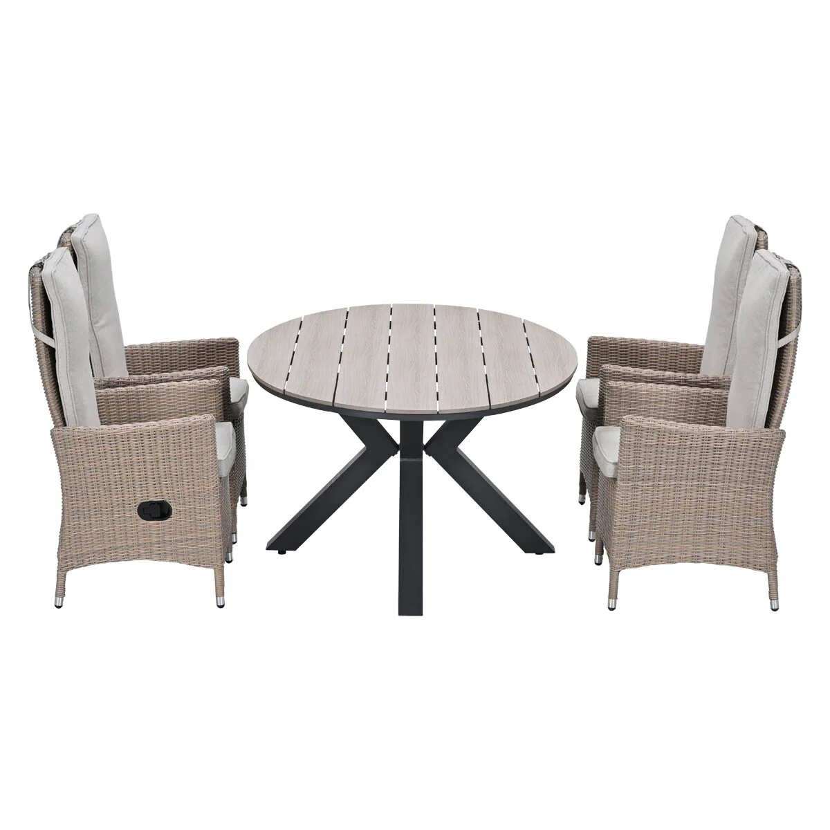 De Collin verstelbare tuinstoel van aluminium en wicker heeft een afmeting van 63 bij 49 cm en is 110 cm hoog. De Tulli aluminium - Vironwood tuintafel heeft een ovale vorm en is 180 bij 115 cm eb is 75 cm hoog.