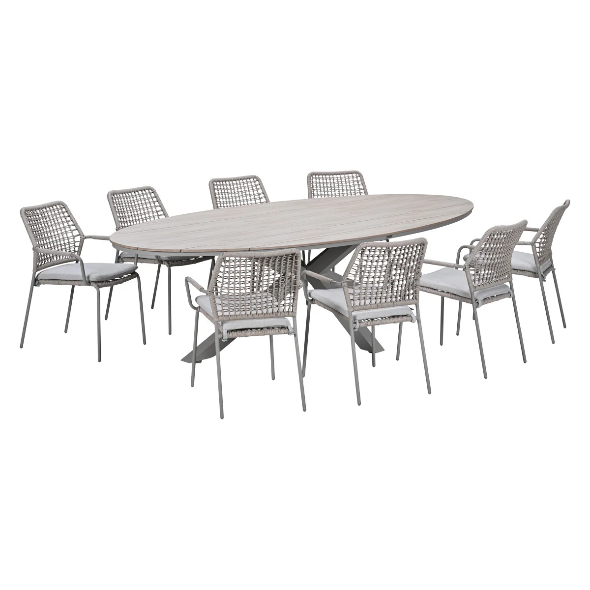 De Natas tuinset heeft een mooie ovale tuintafel met een taupe kleurig frame en prachtig afgewerkte kunststof touw tuinstoelen. De afmeting van de tuinstoel is 56,5 x 63,5 x 84,5 cm en de afmeting van de tuintafel is 280 x 140 x 75 cm.