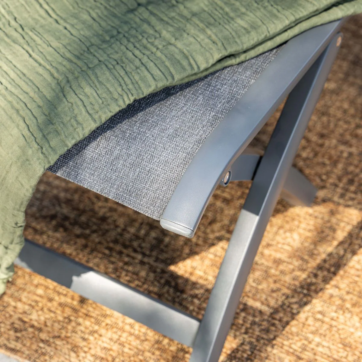 De voetenbank heeft een afmeting van 48 bij 48 cm en is 45 cm hoog. De voetenbank is van aluminium met een donker grijze coating en textileen doek als zitting.