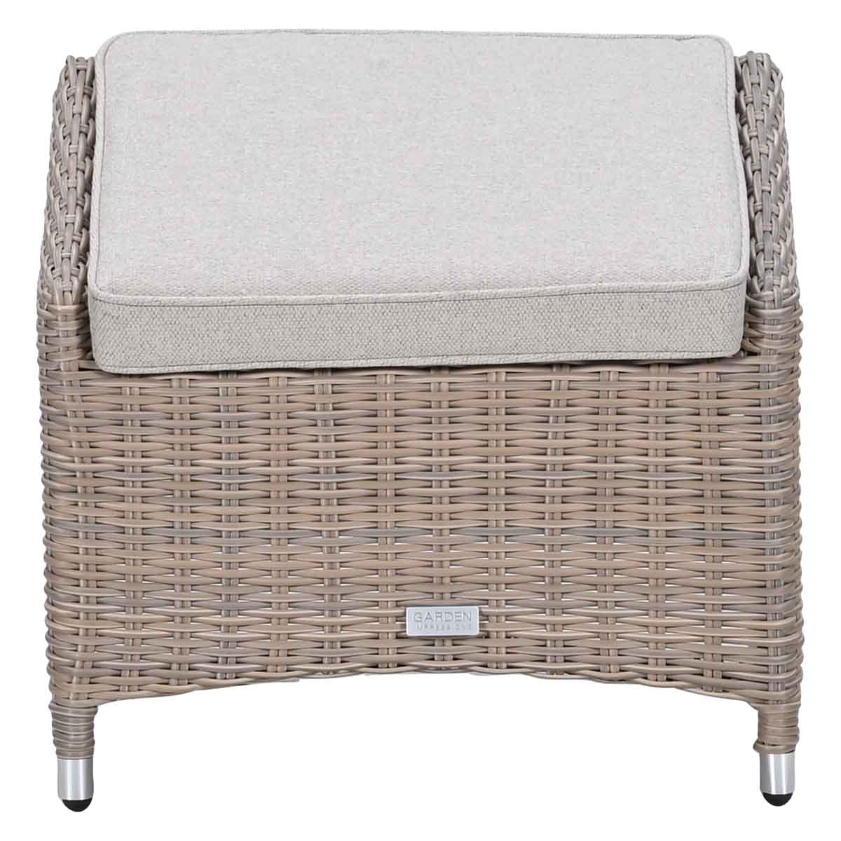 De voetenbank is voorzien van een aluminium binnen frame met daaromheen hand gevlochten 5 mm half rond kunststof wicker draad. Het kussen is gemaakt van hoogwaardige kwaliteit polyester. De afmeting van de voetenbank is : B 53 x D 53 x H 40,5 cm.